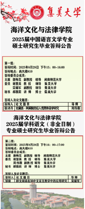 2025届硕士研究生毕业答辩公告(中国语言文学、学科教学(语文))(2025.08.28)