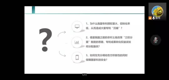 接着,林敬凯同学以西南交大的“职务科技成果权属混合所有制改革”为例,阐述了该改革试点的三个亮点,一是将职务科技成果所有权由单纯的国有改变为单位、个人混合所有;二是将“先转化”改变为“先确权”;三是将成果转化的处置权、使用权和收益权改变为成果的所有权。同时,他剖析了《北京市促进科技成果转化条例》,该条款虽然并没有完全放宽科研人员直接从事科技成果转化的政策,但是规定了科研人员通过协议取得科技成果的转化权以及在科研单位未实施或实施转化工作滞缓情形下科研人员直接取得转化权的情形。